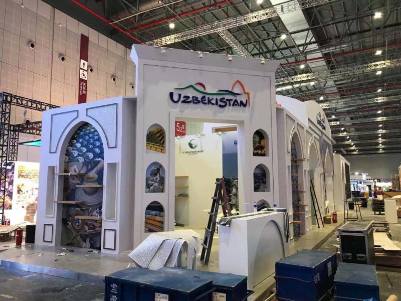 哈萨克斯坦展馆内部以哈萨克斯坦四家企业形象为背景,展现哈萨克斯坦人民凝心聚力共同致力于国家未来发展的美好愿景。乌兹别克斯坦展台用12个单元,分别展示在旅游业、汽车制造业、轻工业、化工业、食品工业等领域所取得的发展成就,并将详细推介最新的投资项目。