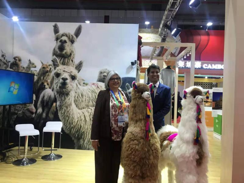 秘鲁国家馆,总体设计充分吸收了秘鲁传统建筑和纺织技艺的精华,其纵横交错的丝线绘制出色彩斑斓的上古神兽与几何图案。秘鲁是全世界羊驼最多的国家,高端纺织品是其特色。去年进博会上,秘鲁国家馆将巨大“羊驼”摆入展馆,成为网红打卡地。今年这一“吸睛”做法将得到延续。
