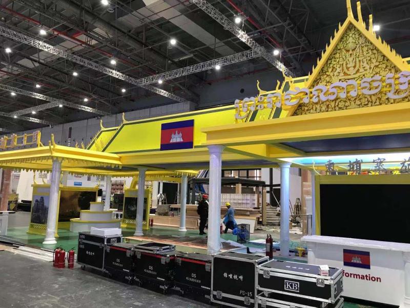 柬埔寨展台彷佛把皇宫“搬”到了进博会,不少细节值得品味。整个场馆及屋顶仿制柬埔寨皇宫,场馆大门仿制柏威夏寺大门,柬埔寨国家名称及国旗将分别放置在屋顶,屋顶由柱子上的小精灵支撑……其它空间的展示区,主要用来展示柬埔寨特色商品,发放经贸宣传资料,推介高棉文化以及旅游和投资。