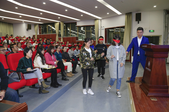 为了让同学能够切实体会盲人的生活,老师邀请了几位同学蒙住双眼从报告厅最后一排自己走到报告桌前,同学们步履艰难、小心翼翼地摸索向前。当同学们完成盲人日常生活的体验之后,对两位“时代新人”表达了崇敬之情,表示一定要心怀感恩,珍惜看似平常的当下。
