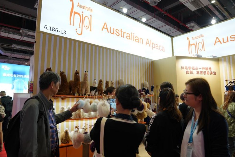 11月9日,澳大利亚INJOI羊驼饰品展台吸引了众多参观者。新华社记者陈倩摄