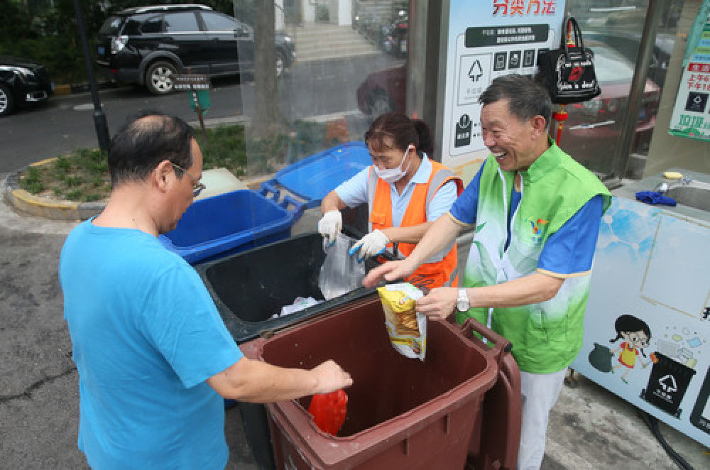 上海闵行区马桥镇夏朵园小区业委会主任陈锡贤(右)在指导小区居民分类投放垃圾(7月25日摄)。新华社发(王翔摄)