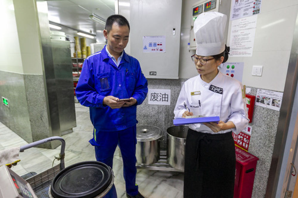 在上海徐汇区唐宫海鲜舫,餐厨废弃油脂收运员曹建林(左)和工作人员统计废油量(10月18日摄)。新华社发(王翔摄)