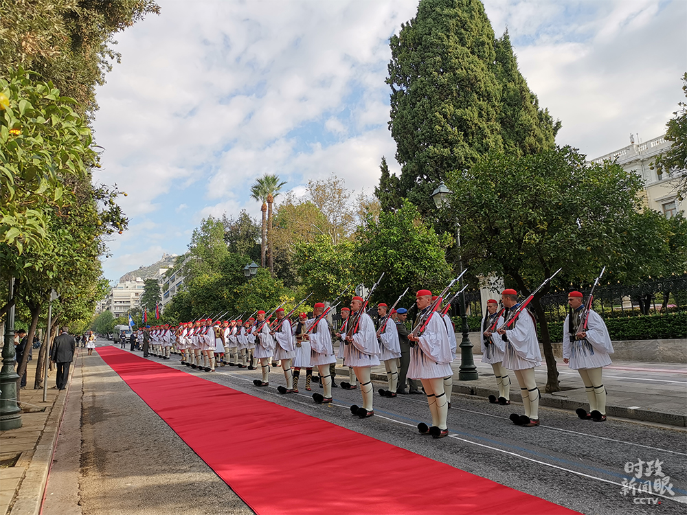 △欢迎仪式上的希腊总统卫队,他们的制服别具特色。(国广记者李晋拍摄)