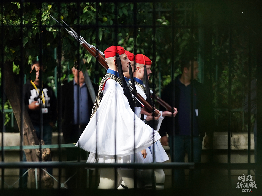 △希腊总统卫队的另一大特色,是他们的标志性慢节奏动作。(央视记者郭晗光拍摄)