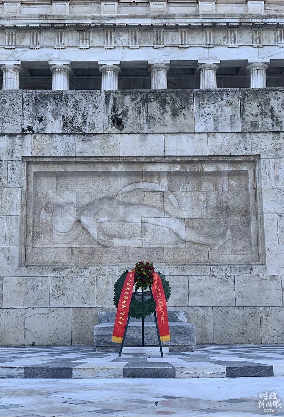 △当天,习近平向希腊无名战士纪念碑献花圈。(央视记者段德文拍摄)