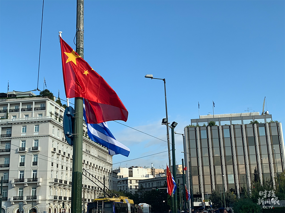 △雅典街头的中希两国国旗。(央视记者石丞拍摄)