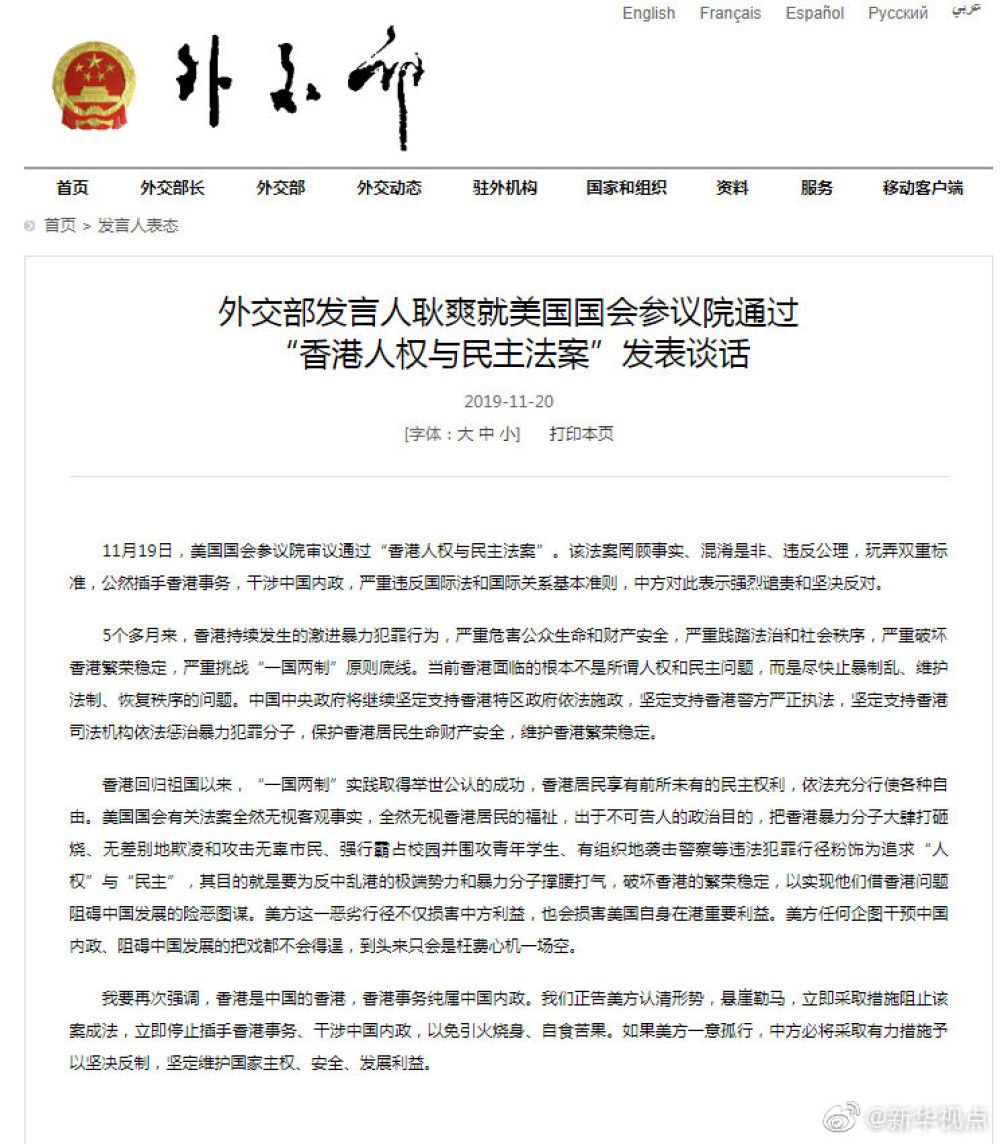 【外交部发言人耿爽就美国国会参议院通过“香港人权与民主法案”发表谈话】11月19日,美国国会参议院审议通过“香港人权与民主法案”。该法案罔顾事实、混淆是非、违反公理,玩弄双重标准,公然插手香港事务,干涉中国内政,严重违反国际法和国际关系基本准则,中方对此表示强烈谴责和坚决反对。