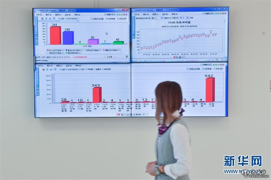11月13日,在位于北京亦庄的12345市民热线话务大厅,一名工作人员从实时监控显示屏前走过。新华社发(彭子洋摄)