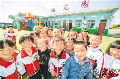贵州省毕节市大方县猫场镇箐口村的箐口小学幼儿园里,孩子们露出开心的笑脸。 罗大富摄(人民图片)