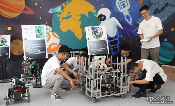 四川大学智能感知与先进控制创新工坊中,团队带头人吴文强正在为同学们演示操作工程车机器人。 张劲松摄
