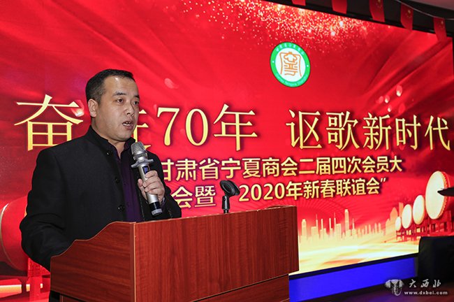 李德成会长在致词中指出,金猪摇尾辞旧岁、玉鼠探头迎新年。在这辞旧迎新的时刻,我们满怀激动的心情,欢聚一堂,隆重举行甘肃省宁夏商会二届四次会员大会暨“2019年迎春联谊会”,共享丰收的喜悦,共庆美好的时光,共话美好的未来。在此,我谨代表甘肃省宁夏商会,向关心和支持我会工作的各位领导、亲爱的会员们致以最热烈地欢迎和最衷心地感谢!祝大家在新的一年里工作顺利,身体健康,阖家欢乐,万事如意!2020年,商会工作面临的形势将更加复杂,工作任务将更加艰巨,工作要求将更加严格。新的一年,我们将上级单位的正确领导下,认真发挥好职能作用,深入搞好学习教育,以服务会员企业的发展,以企业发展促进商会发展为第一要务,以维护企业的合法权益为第一责任,以构建团结和谐商会、创建一流商会为第一目标,全力以赴,开拓创新,切实做好各方面的工作。春潮涌动,诞生希望, 万众一心,催生力量。站在新的发展起点,我们深信,有上级领导的正确领导,有业界同行的关心支持,有全体会员的努力拼搏,我们一定会继续开创商会发展的新局面,为促进陇宁两地的经济发展和社会稳定做出新的更大的贡献!