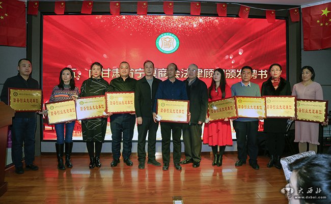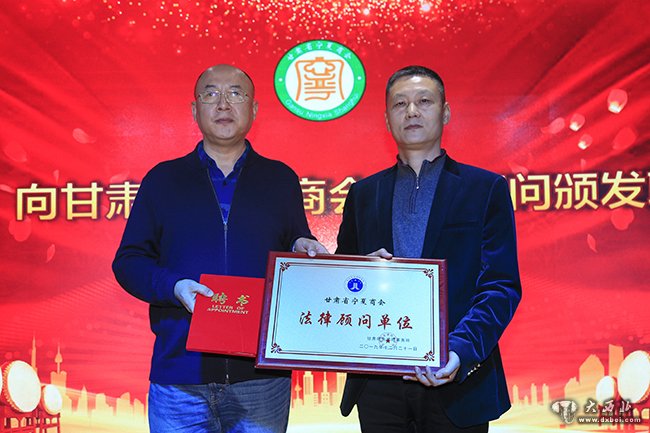 甘肃省宁夏商会副会长马生川为商会聘请的法律顾问颁发聘书。 贾笑云 摄