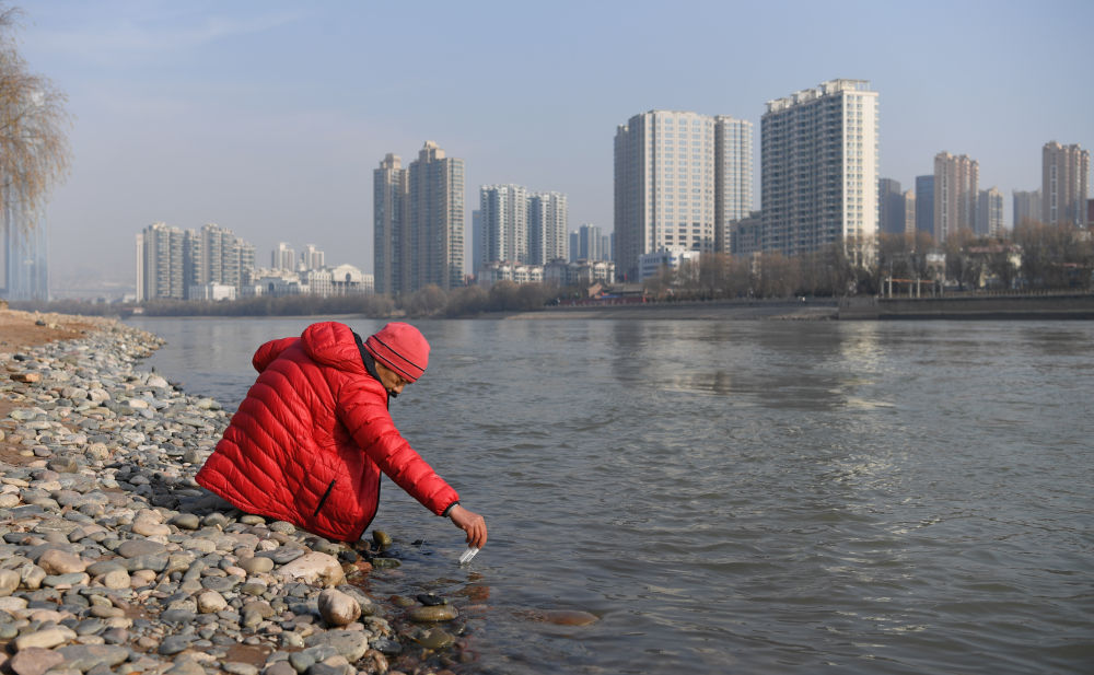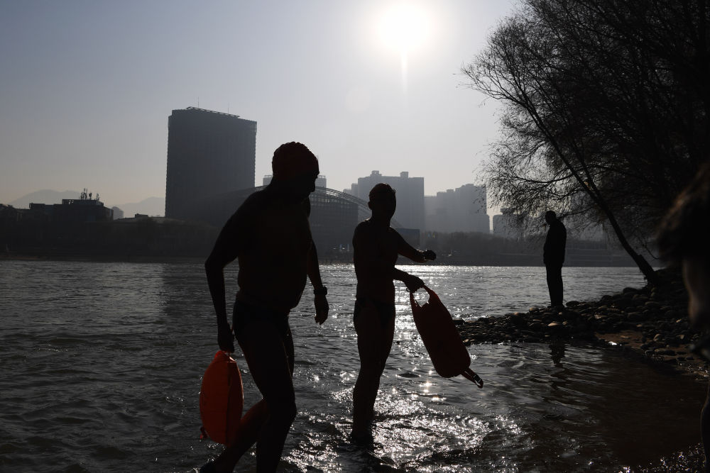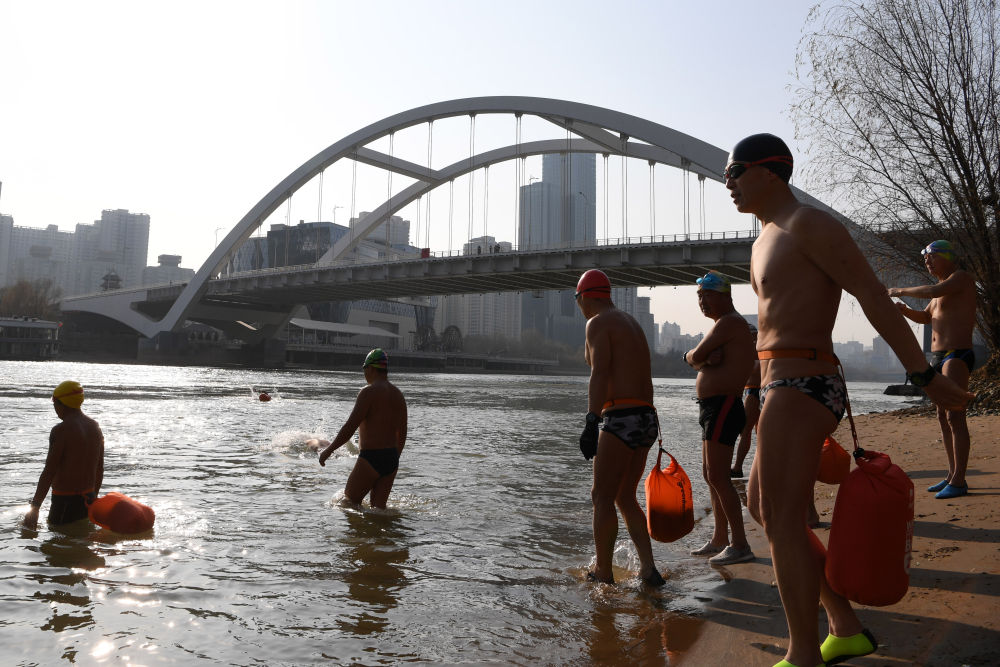 12月19日,在兰州市马拉松文化主题公园附近的黄河岸边,冬泳爱好者入水准备冬泳。新华社记者马宁摄
