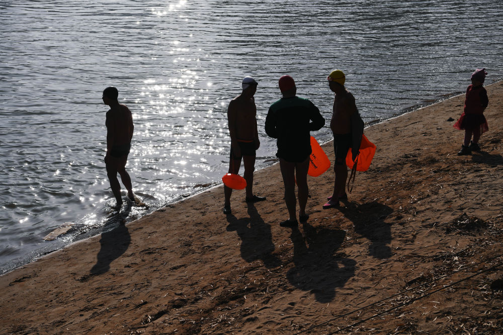 12月21日,冬泳爱好者游完上岸。新华社记者陈斌摄
