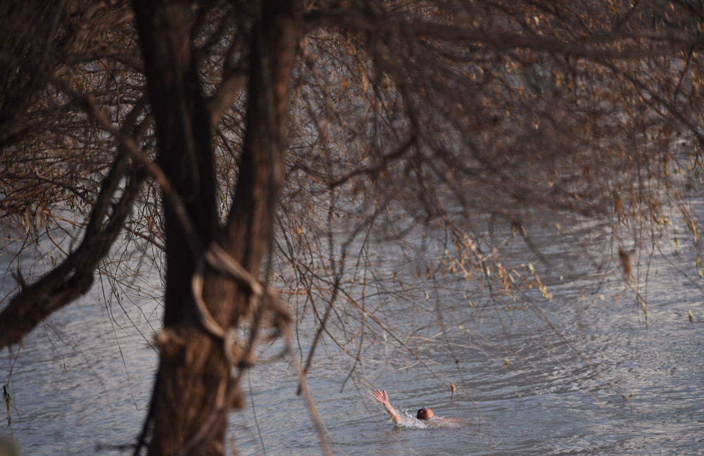 12月20日,冬泳爱好者在黄河冬泳。新华社记者贺长山摄