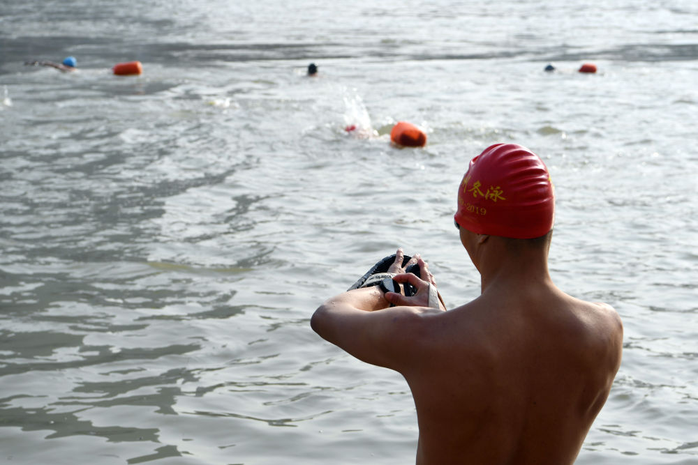 12月20日,一名冬泳爱好者在进入黄河冬泳前给自己计时。新华社记者马宁摄