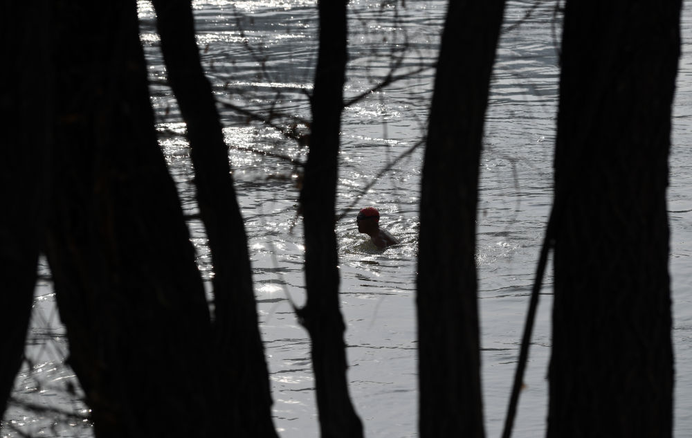 12月18日,冬泳爱好者赵西普在黄河冬泳。新华社记者陈斌摄