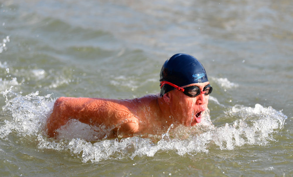 12月20日,83岁的冬泳爱好者周汉英在黄河冬泳。新华社记者陶希夷摄