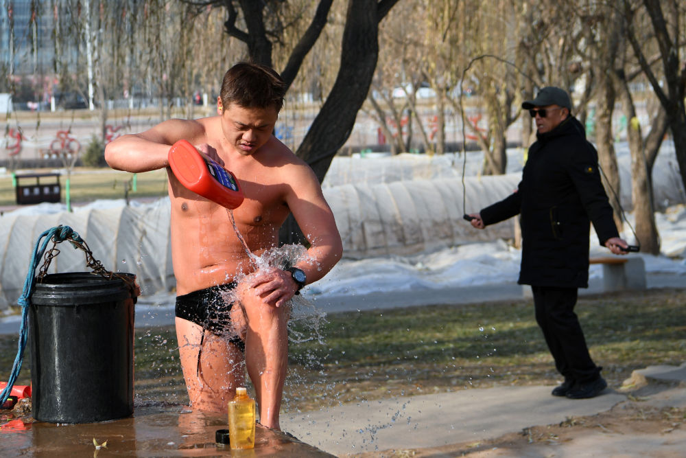 12月18日,冬泳爱好者李勇在上岸前向身上泼水。新华社记者陈斌摄