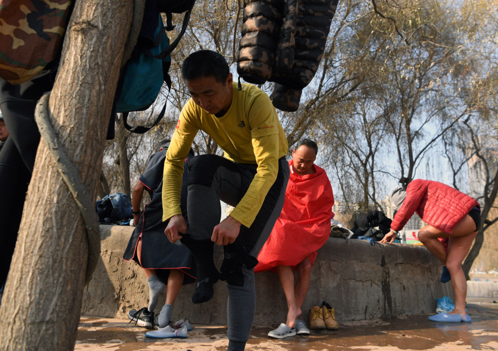 12月20日,冬泳爱好者在黄河冬泳后在河边换衣服。新华社记者马宁摄