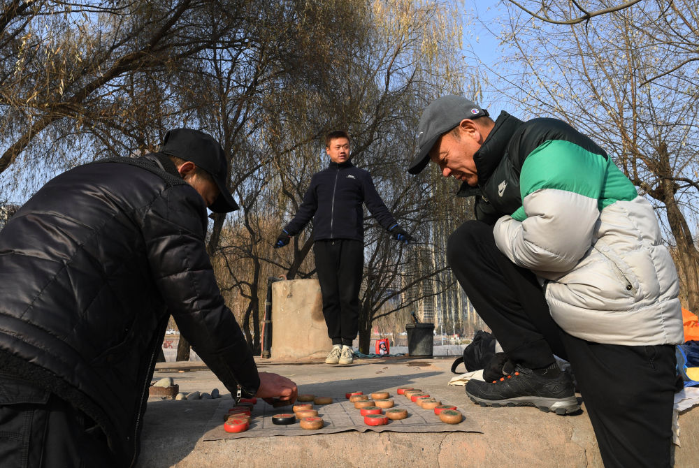 12月20日,冬泳爱好者张敏捷(中)冬泳后上岸跳绳暖身,张胜(右)结束冬泳后在一旁下棋。新华社记者陶希夷摄