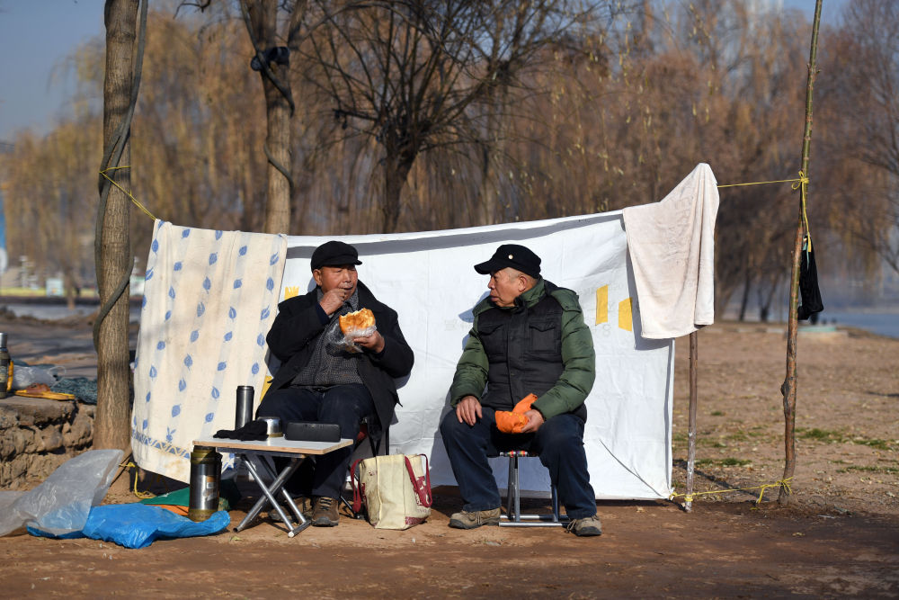 12月21日,72岁的石金城(左)在黄河中冬泳后在岸边晒太阳,一边听着西北民歌吃东西一边和朋友交谈。新华社记者陶希夷摄