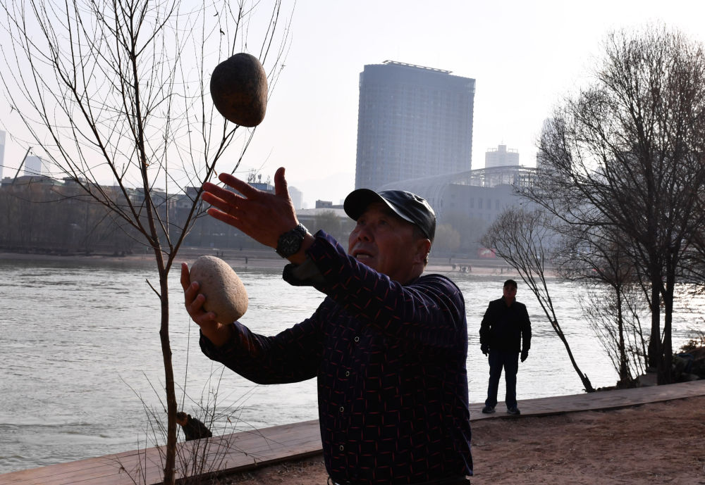 12月20日,冬泳爱好者赵子银冬泳后在岸边扔石头暖身。新华社记者贺长山摄