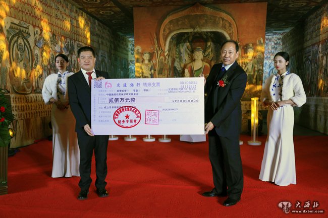 普康集团董事长冯淑刚向敦煌艺术专项基金会理事长杨秀清捐赠200万元支票