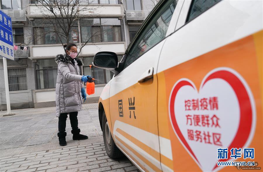 1月27日,武汉市武昌区粮道街昙华林社区干部在给配给社区使用的出租车消毒。新华社记者 程敏 摄