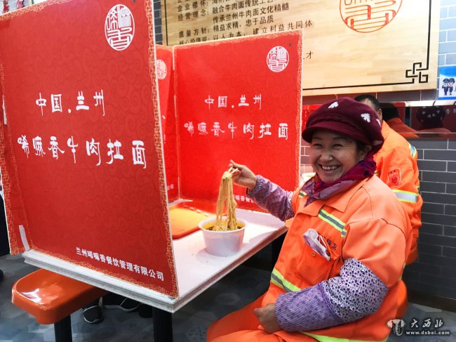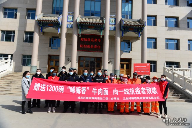 大 西 北 网 讯 “师傅们辛苦了!快进来歇歇脚吧!”在位于雁滩公园的“唏嘛香”牛肉面馆,负责人王泉荣正在热情招待环卫工人。3月6日上午,兰州市城关区雁南街道携手“唏嘛香”牛肉面向抗疫一线的城管、环卫工、志愿者捐赠1300碗牛肉面,在这场没有硝烟的战场上,处处显露出温情。