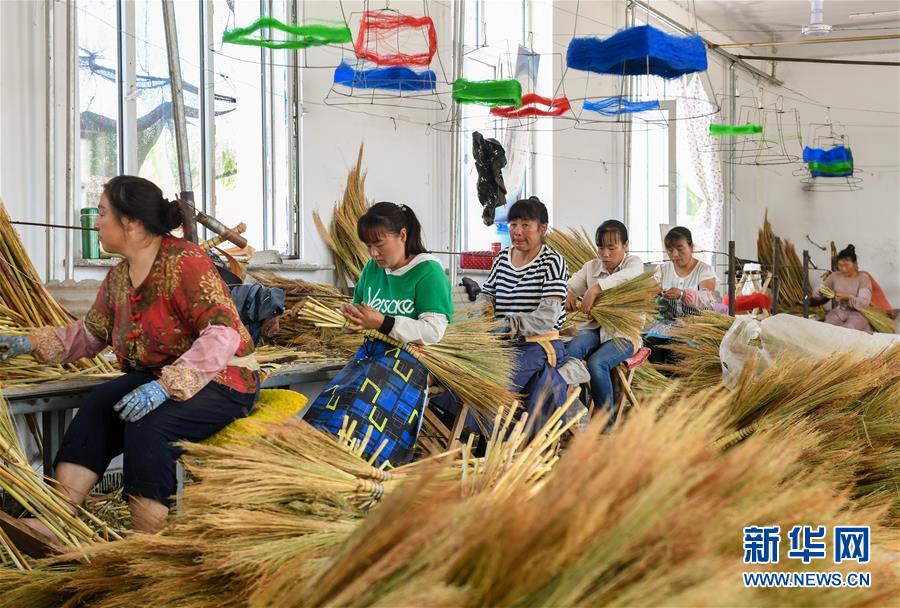 贫困户在内蒙古赤峰市巴林左旗林东镇扶贫车间内制作笤帚(2019年8月5日摄)。新华社记者彭源摄