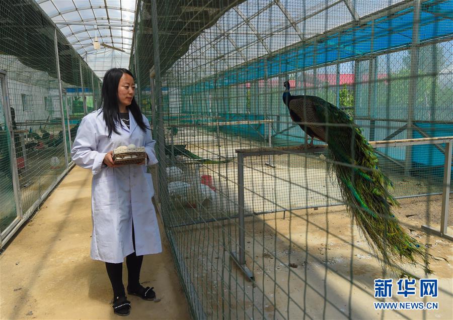 周海南在内蒙古兴安盟乌兰浩特市义勒力特镇蒙雀养殖专业合作社照料孔雀。养殖孔雀带动贫困户脱贫致富(2018年5月21日摄)。新华社记者彭源摄