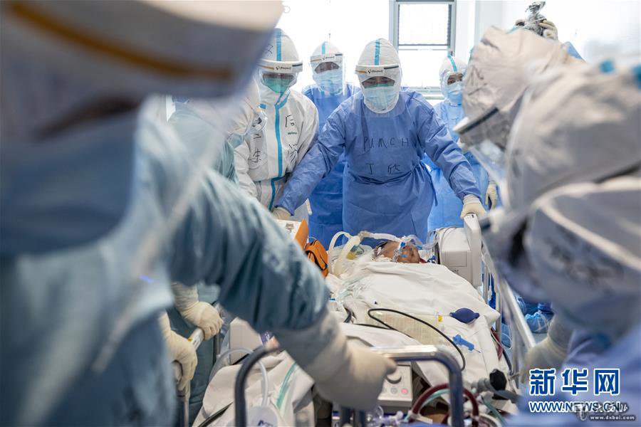 4月12日,北京协和医院医疗队队员与武汉同济医院医务人员共同将一名新冠肺炎危重症患者转往武汉同济医院中法新城院区ICU。在转运过程中,ECMO(人工膜肺)治疗仍在持续进行。新华社记者沈伯韩摄