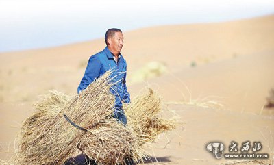 图为甘肃古浪县北部沙区旱麻岗治沙点,一位治沙人在搬运稻草(摄于今年3月)。马希平摄(新华社发)