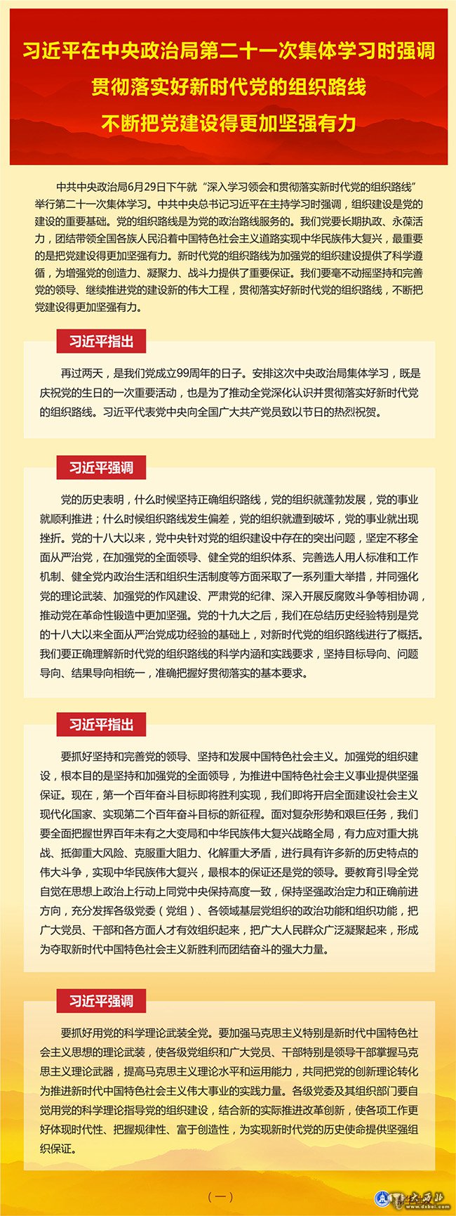 习近平在主持学习时发表了讲话。他指出,再过两天,是我们党成立99周年的日子。安排这次中央政治局集体学习,既是庆祝党的生日的一次重要活动,也是为了推动全党深化认识并贯彻落实好新时代党的组织路线。习近平代表党中央向全国广大共产党员致以节日的热烈祝贺。