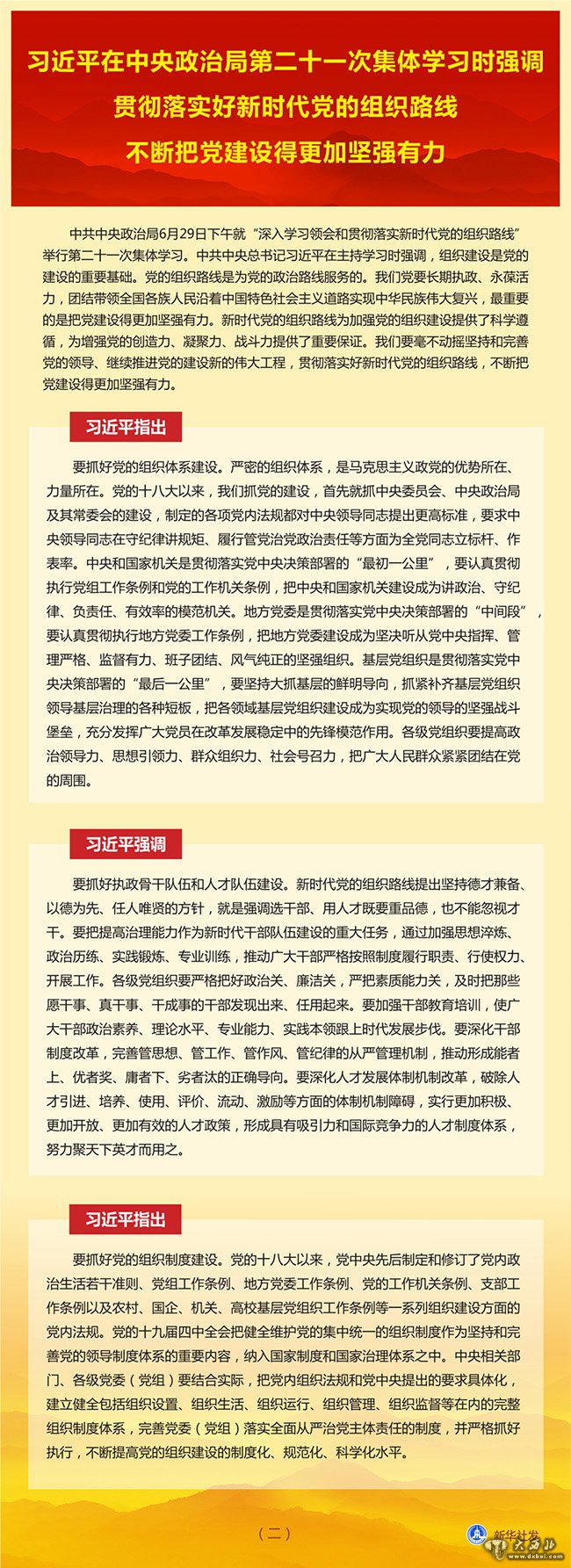新华社北京6月30日电 中共中央政治局6月29日下午就“深入学习领会和贯彻落实新时代党的组织路线”举行第二十一次集体学习。中共中央总书记习近平在主持学习时强调,组织建设是党的建设的重要基础。党的组织路线是为党的政治路线服务的。我们党要长期执政、永葆活力,团结带领全国各族人民沿着中国特色社会主义道路实现中华民族伟大复兴,最重要的是把党建设得更加坚强有力。新时代党的组织路线为加强党的组织建设提供了科学遵循,为增强党的创造力、凝聚力、战斗力提供了重要保证。我们要毫不动摇坚持和完善党的领导、继续推进党的建设新的伟大工程,贯彻落实好新时代党的组织路线,不断把党建设得更加坚强有力。