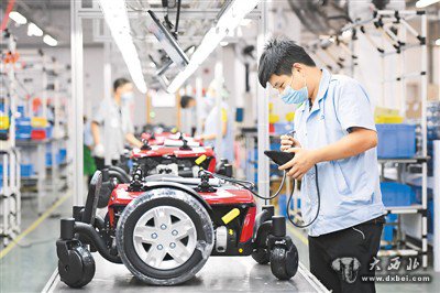 近来,江西省丰城市外贸企业通过与电商平台合作、云推介等方式促进企业稳产增效。图为丰城市捷和电机(江西)有限公司员工在生产线上组装电动轮椅车,准备出口至欧洲、中东、非洲等地市场。周 亮摄(人民视觉)