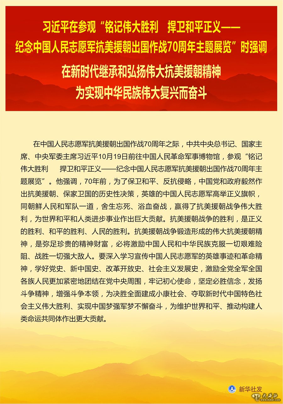 新华社北京10月19日电 在中国人民志愿军抗美援朝出国作战70周年之际,中共中央总书记、国家主席、中央军委主席习近平19日前往中国人民革命军事博物馆,参观“铭记伟大胜利 捍卫和平正义——纪念中国人民志愿军抗美援朝出国作战70周年主题展览”。他强调,70年前,为了保卫和平、反抗侵略,中国党和政府毅然作出抗美援朝、保家卫国的历史性决策,英雄的中国人民志愿军高举正义旗帜,同朝鲜人民和军队一道,舍生忘死、浴血奋战,赢得了抗美援朝战争伟大胜利,为世界和平和人类进步事业作出巨大贡献。抗美援朝战争的胜利,是正义的胜利、和平的胜利、人民的胜利。抗美援朝战争锻造形成的伟大抗美援朝精神,是弥足珍贵的精神财富,必将激励中国人民和中华民族克服一切艰难险阻、战胜一切强大敌人。要深入学习宣传中国人民志愿军的英雄事迹和革命精神,学好党史、新中国史、改革开放史、社会主义发展史,激励全党全军全国各族人民更加紧密地团结在党中央周围,牢记初心使命,坚定必胜信念,发扬斗争精神,增强斗争本领,为决胜全面建成小康社会、夺取新时代中国特色社会主义伟大胜利、实现中国梦强军梦不懈奋斗,为维护世界和平、推动构建人类命运共同体作出更大贡献。