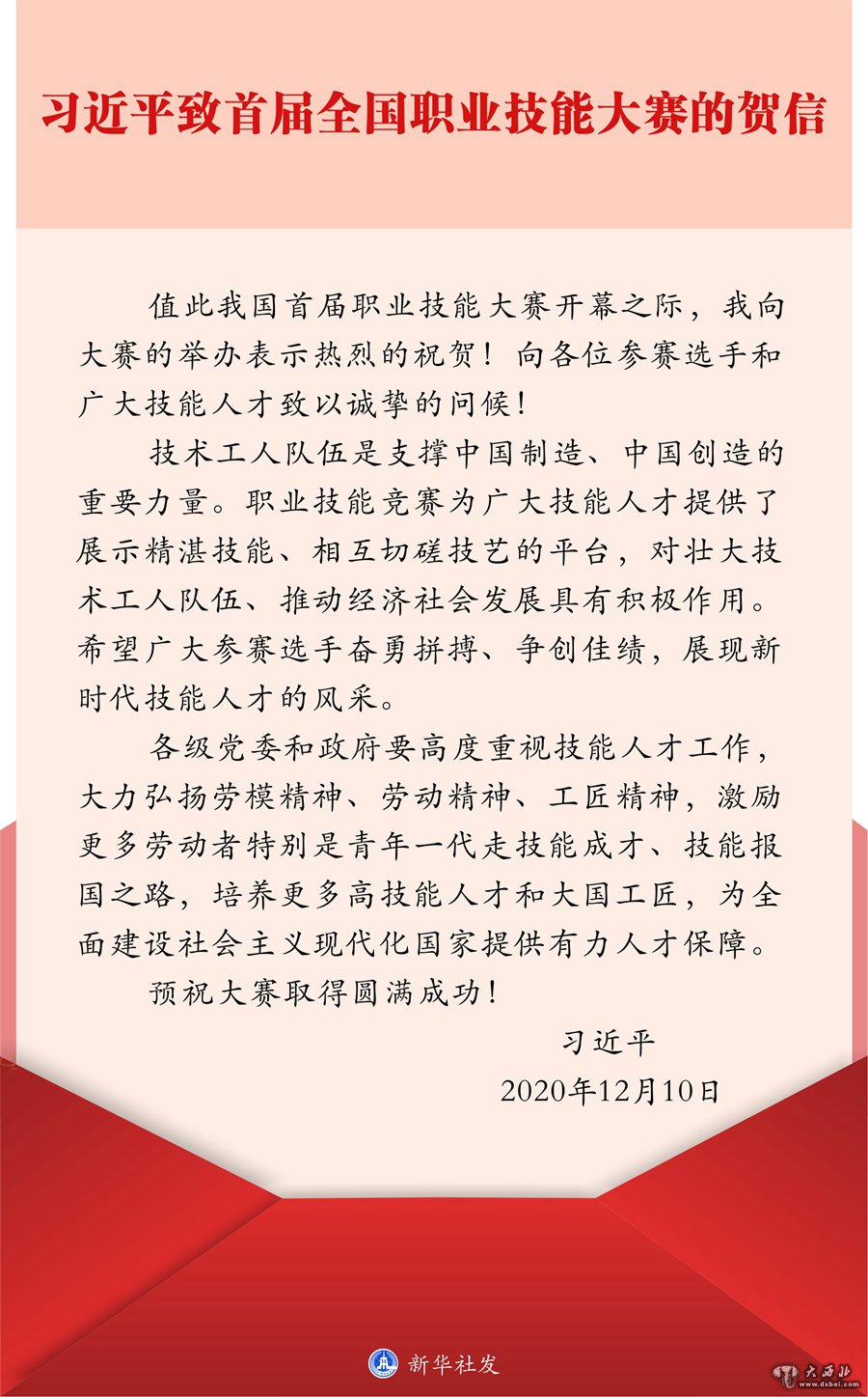 习近平在贺信中指出,技术工人队伍是支撑中国制造、中国创造的重要力量。职业技能竞赛为广大技能人才提供了展示精湛技能、相互切磋技艺的平台,对壮大技术工人队伍、推动经济社会发展具有积极作用。希望广大参赛选手奋勇拼搏、争创佳绩,展现新时代技能人才的风采。