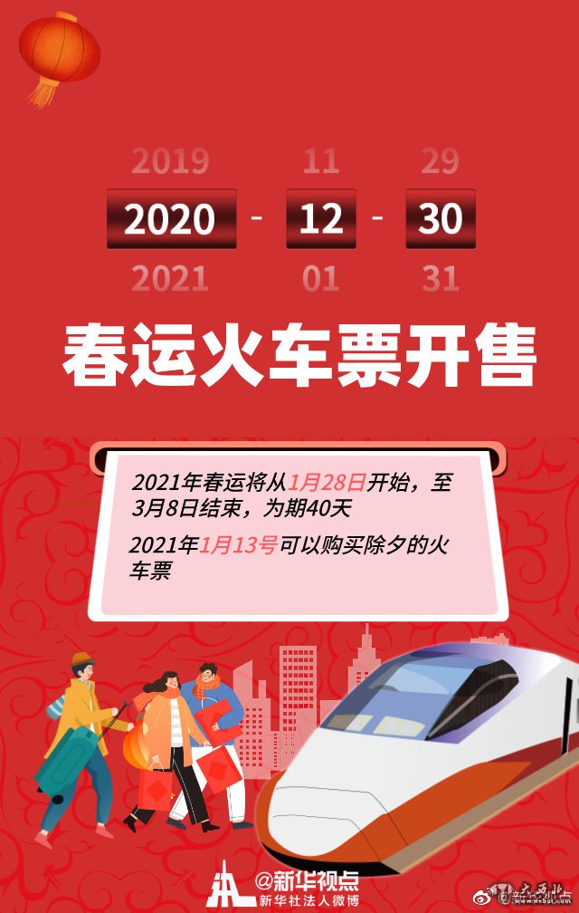 12月30日,2021年春运火车票正式开始发售。2021年春运将从1月28日开始,至3月8日结束,为期40天。不知道你做好出行计划了吗?说到买票,让小编为你敲重点:1月13日前后可以购买除夕前后的火车票;想安安静静旅行,你可以选择静音车厢;票没抢到,你可以通过“候补购票”功能试试运气。考虑疫情原因,建议有条件的旅客错峰出行,避开春运高峰期,出行时做好防护措施,全程佩戴口罩。(记者樊曦周圆)
