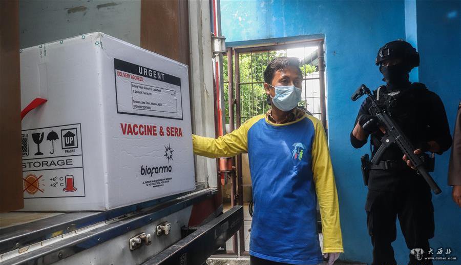 1月4日,在印度尼西亚东爪哇省泗水市,工作人员搬运新冠疫苗。自1月4日起,印尼卫生部开始向全国34个省级行政区分发由中国科兴公司研制的新冠疫苗。 新华社发(苏尔亚 摄)