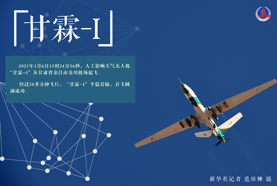 新华社兰州1月6日电 6日15时24分56秒,人工影响天气无人机“甘霖-I”从甘肃省金昌市金川机场起飞,起飞后地面控制系统显示无人机防除冰、大气探测、催化剂播撒等功能正常,系统稳定,性能满足项目要求,经过30多分钟飞行,“甘霖-I”平稳着陆,首飞圆满成功。
