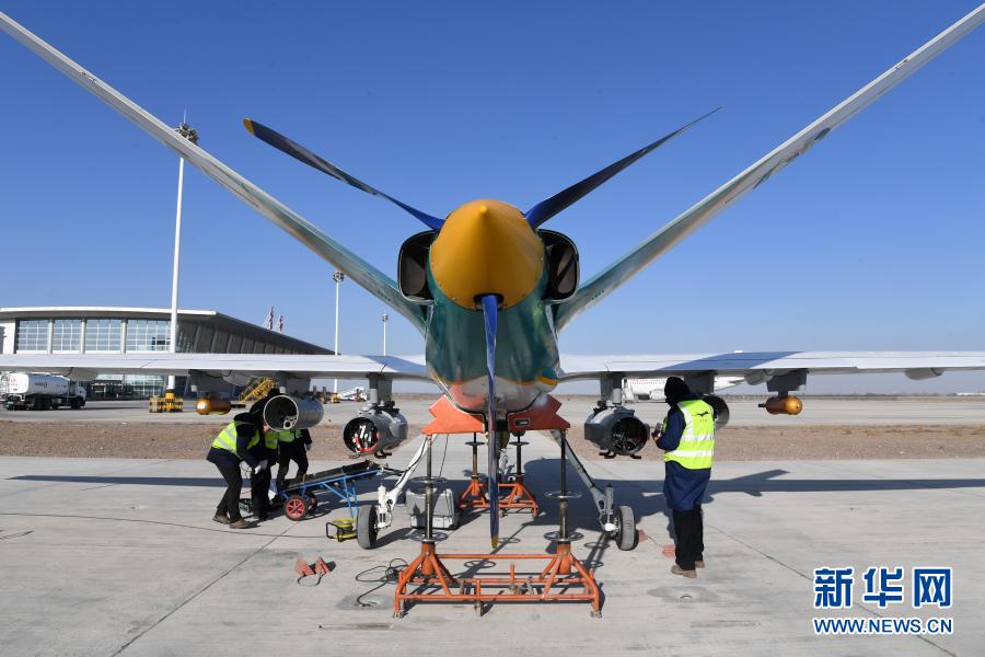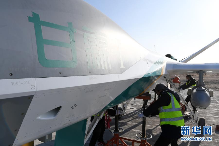 1月6日,在金昌金川机场,技术人员对人工影响天气无人机“甘霖-I”首飞进行最后检查。新华社记者 范培珅 摄