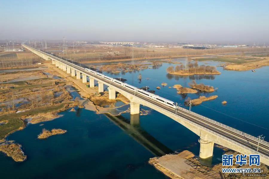 ▲运行试验动车组列车通过徐连高铁沂河特大桥(2021年1月8日摄,无人机照片)。徐连高铁位于江苏省北部黄淮平原地区,西起徐州市,东至连云港市,正线全长约180公里。新华社记者季春鹏摄