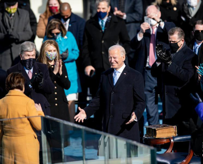 当日,美国当选总统、民主党人拜登在华盛顿国会山举行的就职典礼上宣誓就任美国第46任总统。