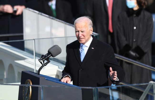 1月20日,在美国首都华盛顿国会山,拜登在美国第46任总统就职典礼上发表讲话。