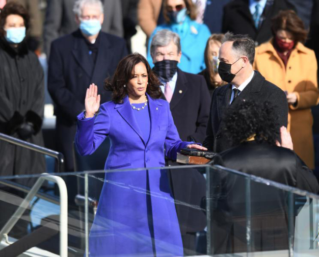 1月20日,在美国首都华盛顿国会山,哈里斯(前左)在就职典礼上宣誓就任美国副总统。