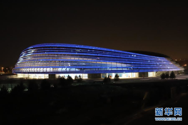 这是2020年12月15日拍摄的进行场馆外立面泛光照明调试的国家速滑馆“冰丝带”.新华社记者 张骁 摄