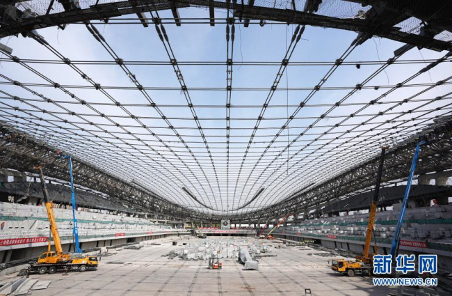 这是2019年4月8日拍摄的完成屋面索网结构张拉工程的国家速滑馆。新华社记者 鞠焕宗 摄
